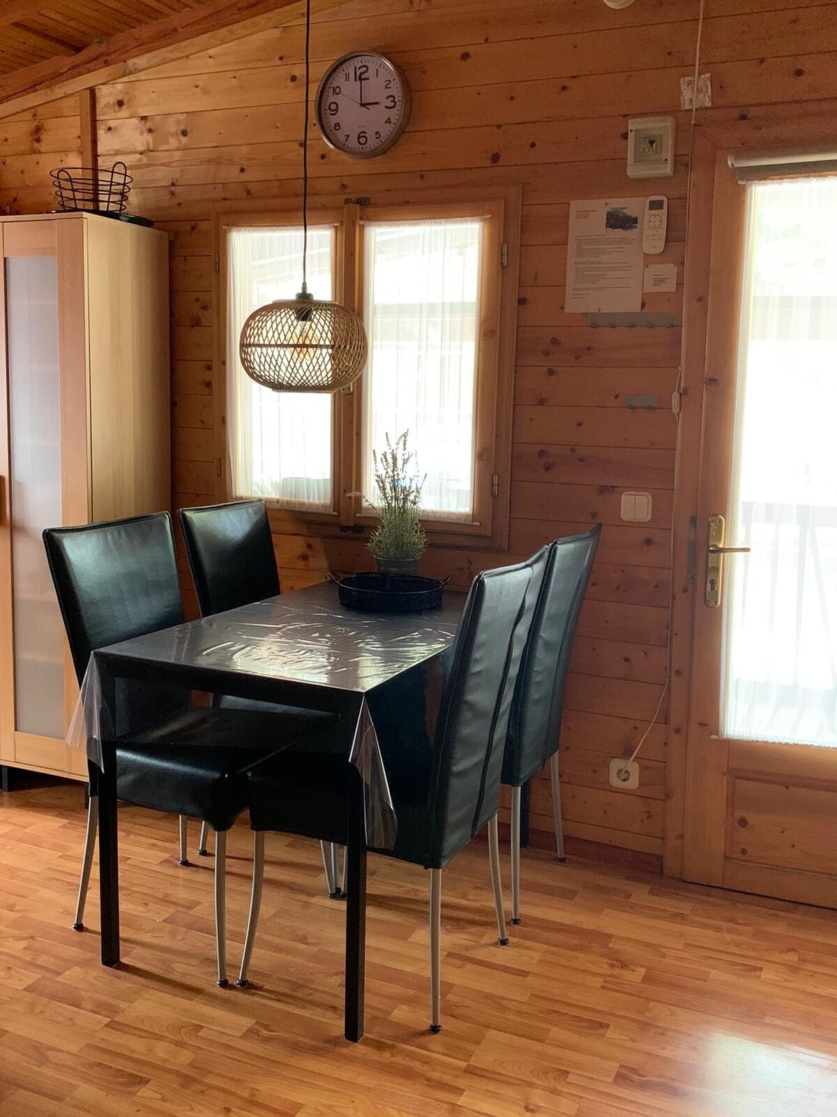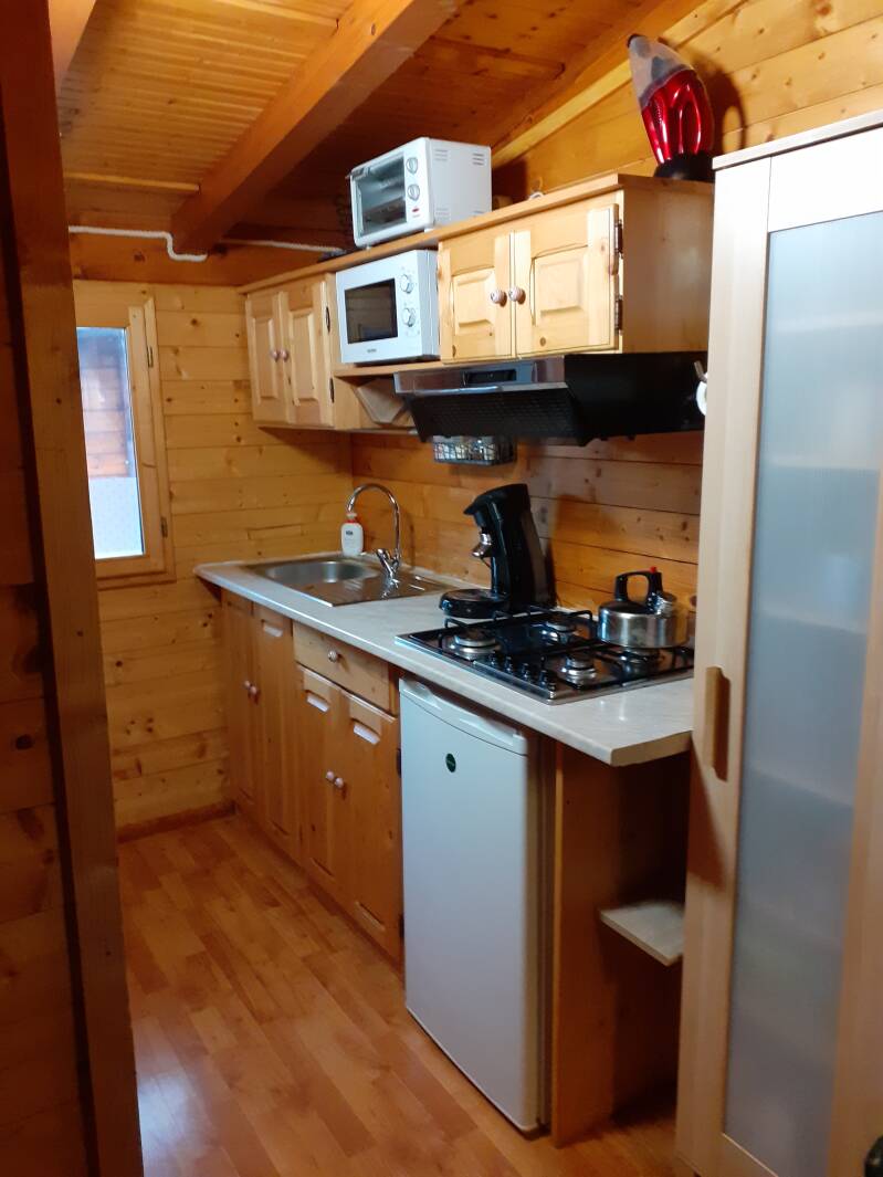 Keuken: Het chalet is voorzien van een complete keukeninventaris waaronder magnetron, oven, koelkast met vriesvak, 4 pits gastoestel, afzuigkap, Senseo koffiezetapparaat, grillplaat/elektrische barbecue (ook voor op de veranda te gebruiken) en kinderstoel.