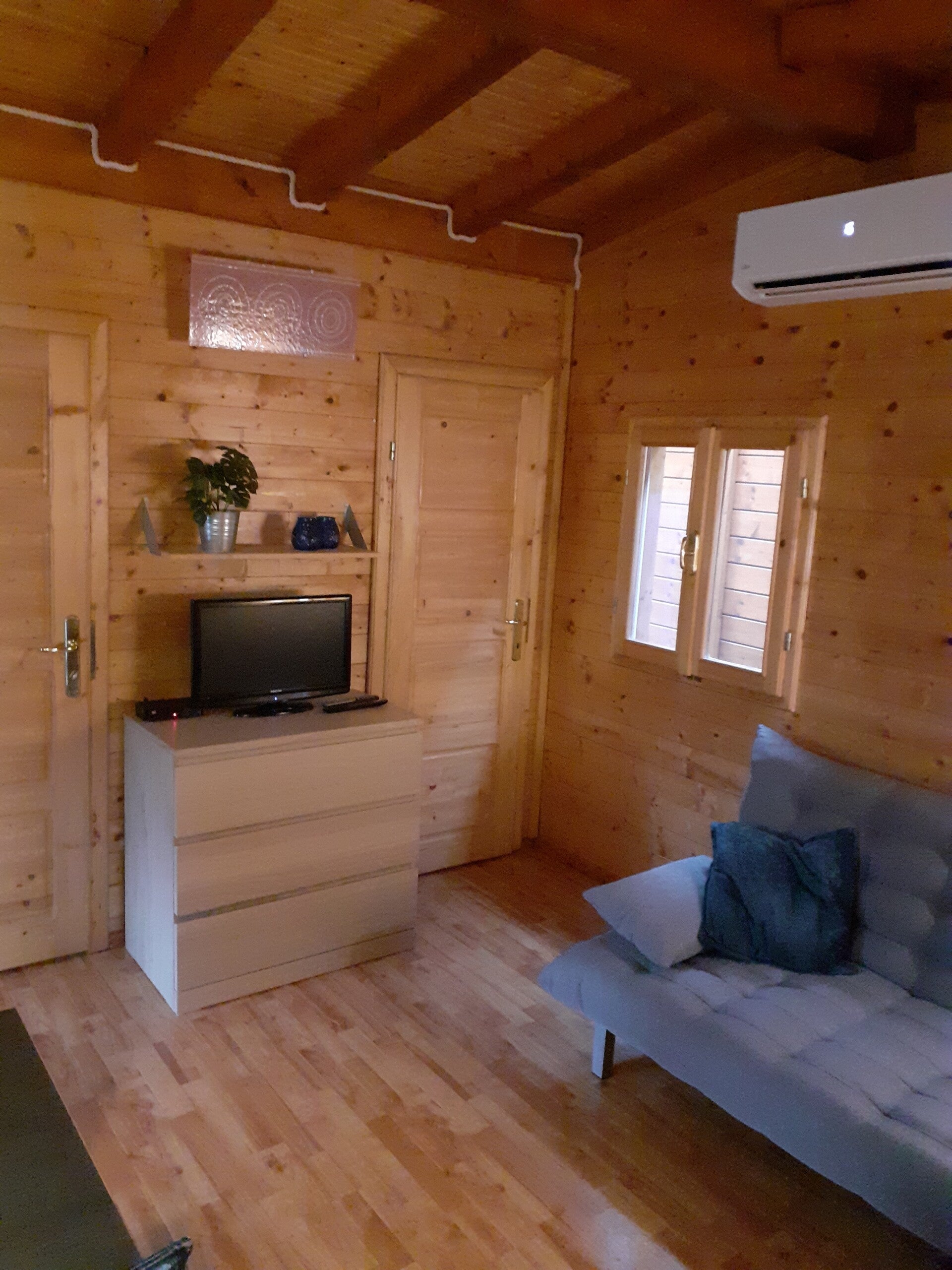 Woonkamer: Tafel met 4 stoelen en een gezellige zithoek voorzien van TV/DVD (schotelontvangst met 170 Nederlandse televisie- en radiozenders via Canal Digitaal). Airconditioning, radio/cd speler en elektrische kachel. De bank is gemakkelijk uit te klappen om als slaapbank (1 persoon) te gebruiken.